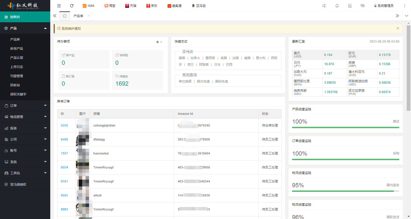 首頁(yè)展示系統(tǒng)最新通知、待辦事項(xiàng)、最新匯率以及用戶方便、快捷的定位查看自己店鋪的異常訂單等